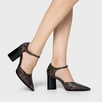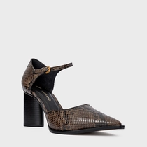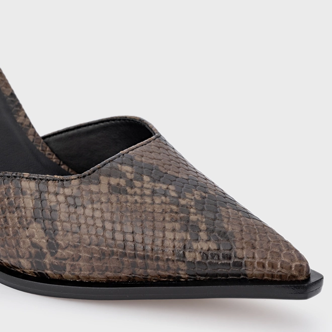 Scarpin slingback em couro snake, com bico fino e salto bloco. Possui cabedal fechado na parte frontal, abertura lateral e tira no tornozelo com fechamento por fivela ajustável.