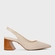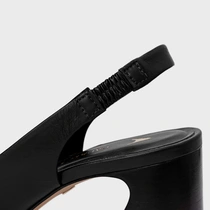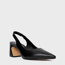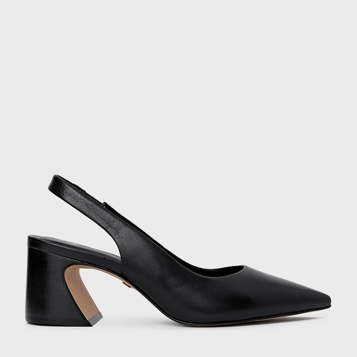 Scarpin slingback em couro, com salto em formato geométrico. Possui o bico fino e elástico traseiro para facilitar o calce.