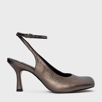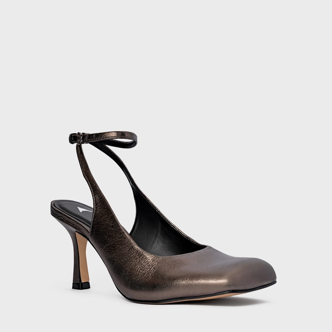 Scarpin slingback em couro metalizado, com bico arredondado e salto fino. Possui cabedal fechado e tira traseira com fechamento por fivela ajustável.
