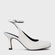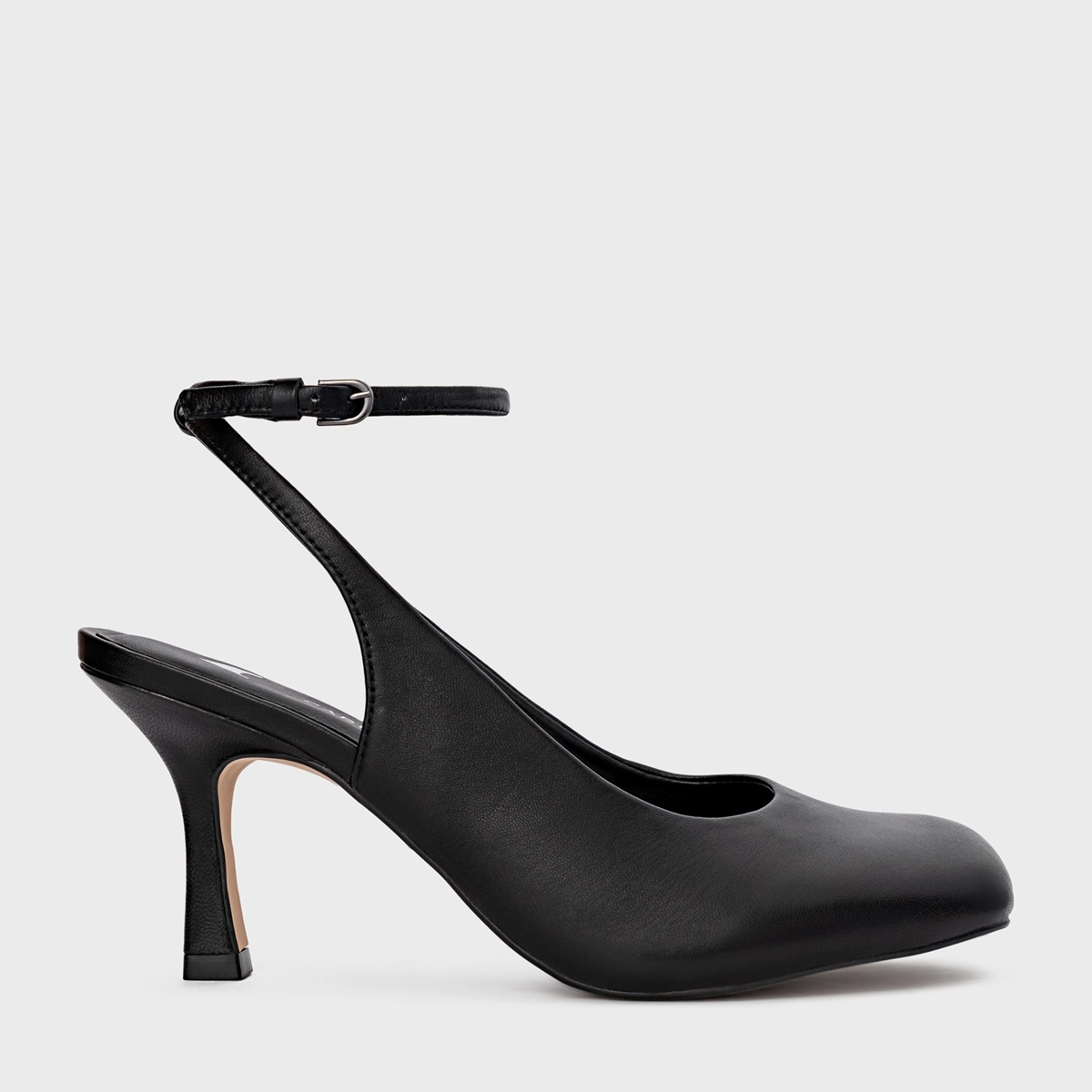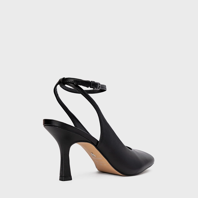 Scarpin slingback em couro, com bico arredondado e salto fino. Possui cabedal fechado e tira traseira com fechamento por fivela ajustável.
