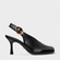 Scarpin slingback de couro com bico quadrado alongado e salto médio. Possui abertura traseira e fechamento por fivela dourada arredondada e ajustável.