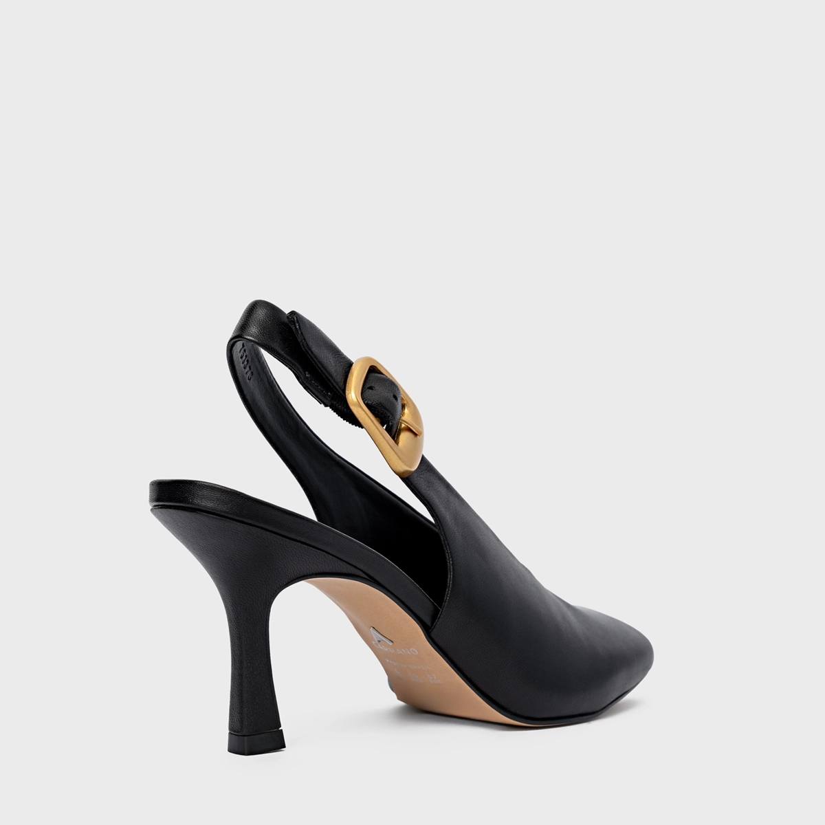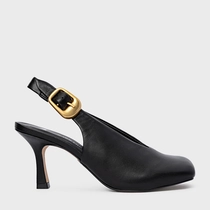 Scarpin slingback em couro, com salto fino e bico quadrado alongado. Aberta atrás, conta com tira ajustável por fivela dourada.