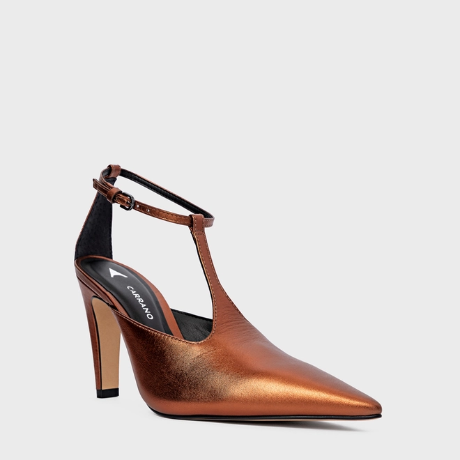 Scarpin slingback em couro metalizado com bico fino alongado e salto alto com uma largura robusta. Cabedal fechado, recorte em V no peito do pé e tira fina no tornozelo fazendo fechamento.