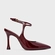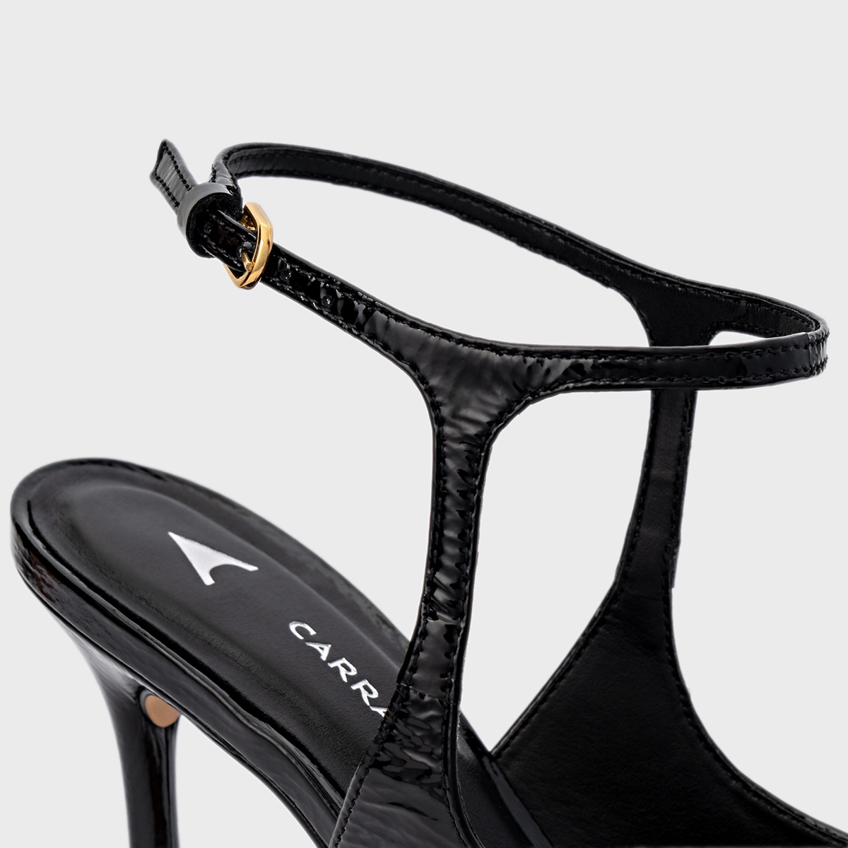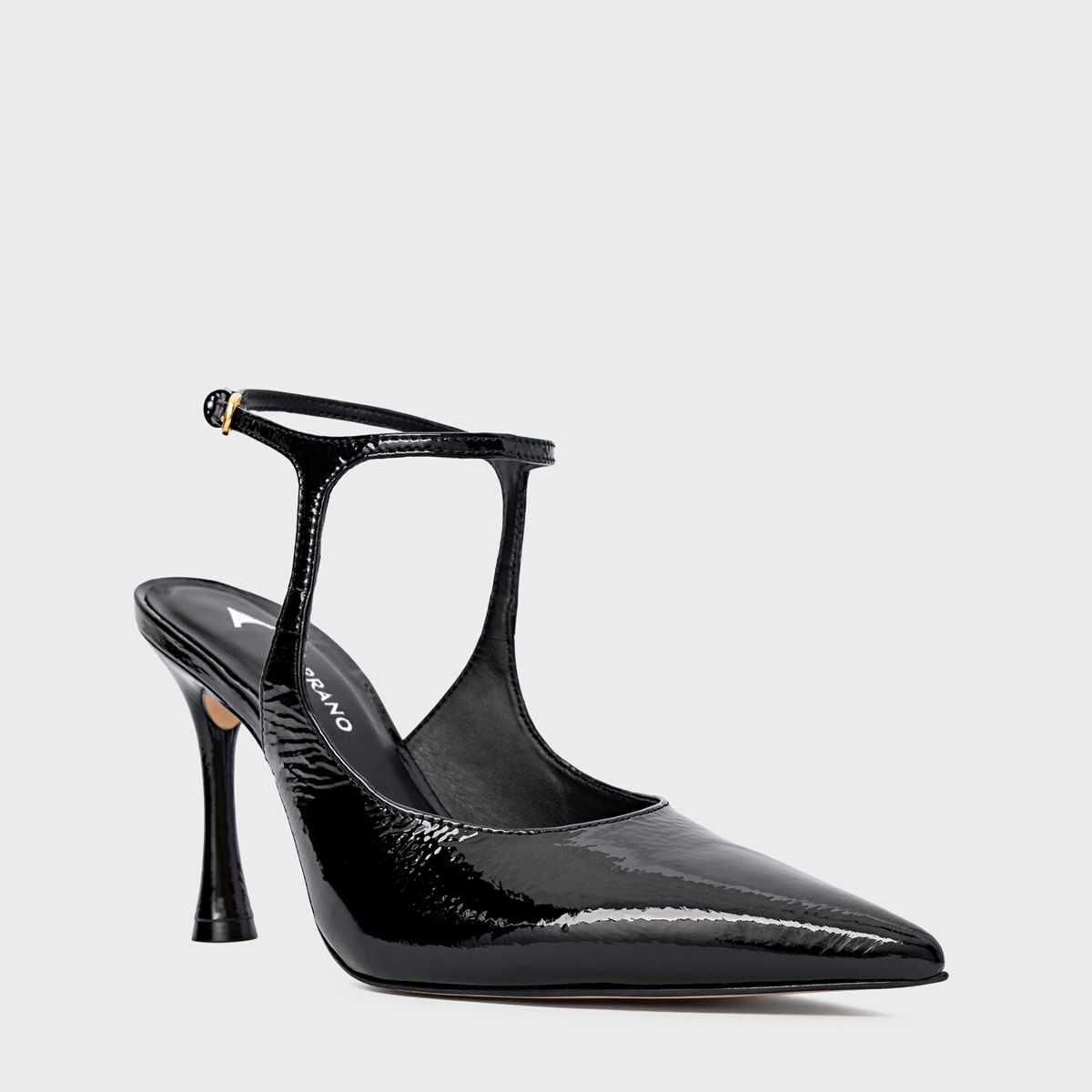 Scarpin slingback em couro verniz, com bico fino e salto fino. Possui cabedal fechado, recorte delicado no peito do pé e tira fina no tornozelo com fechamento por fivela ajustável.