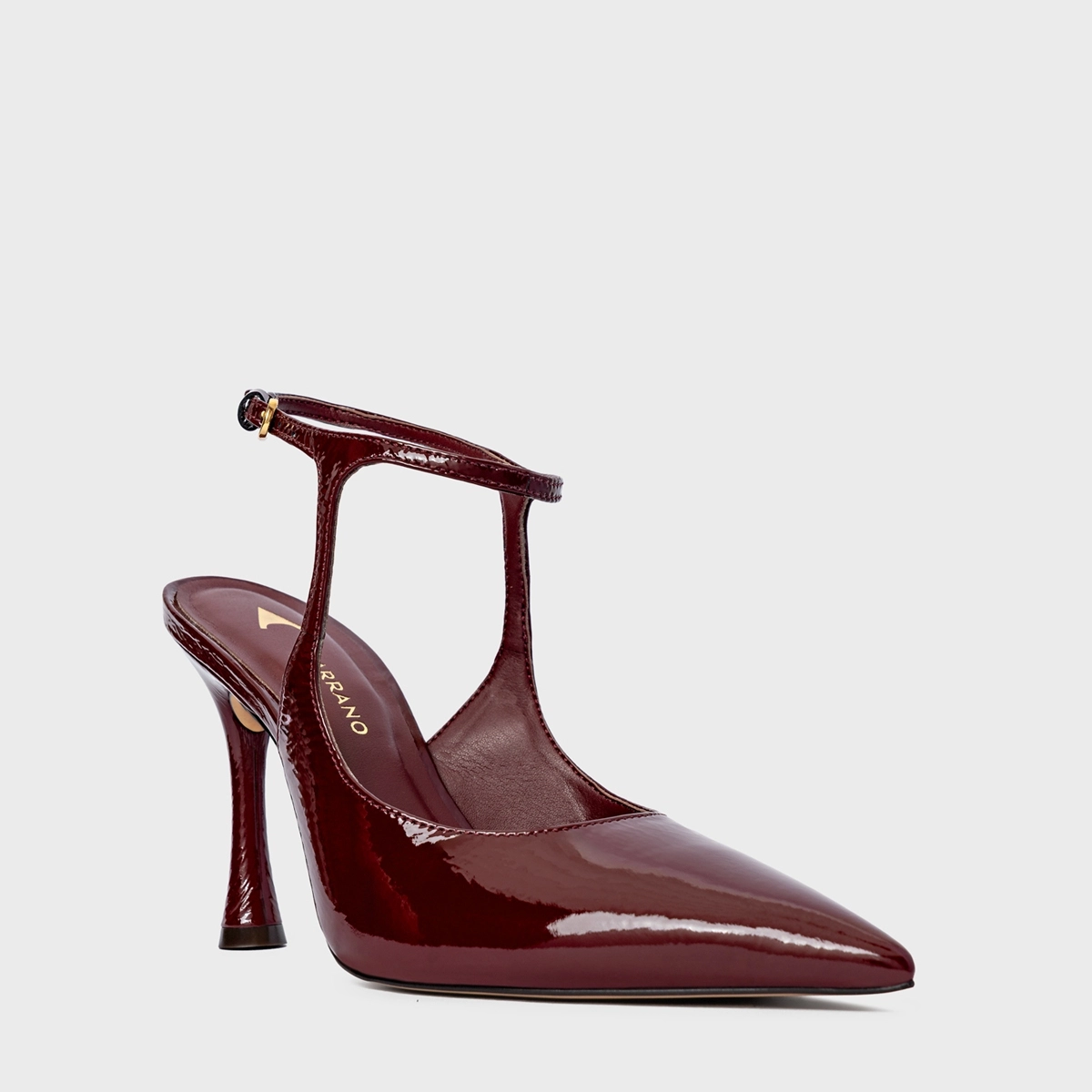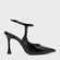 Scarpin slingback em couro verniz, com bico fino e salto fino. Possui cabedal fechado, recorte delicado no peito do pé e tira fina no tornozelo com fechamento por fivela ajustável.