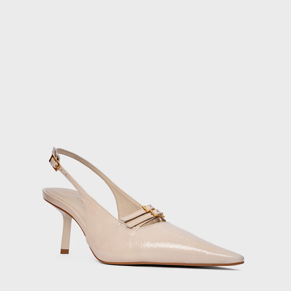 Scarpin slingback em couro verniz, com bico fino e salto stiletto. Possui cabedal fechado, detalhe frontal com aplicação de fivelas e tira traseira com fechamento por fivela ajustável.
