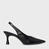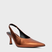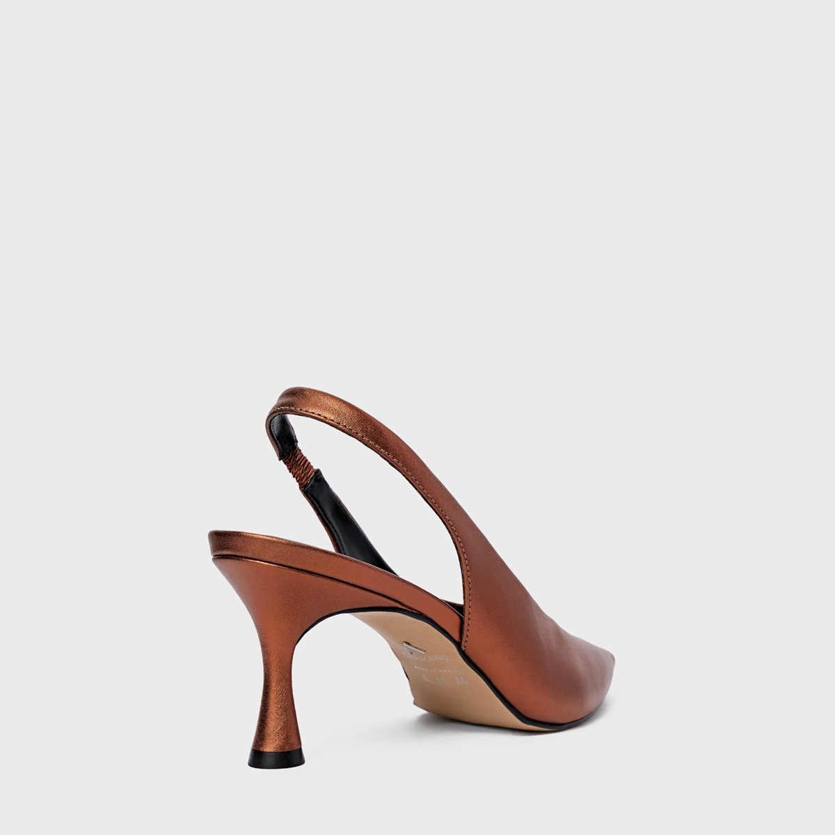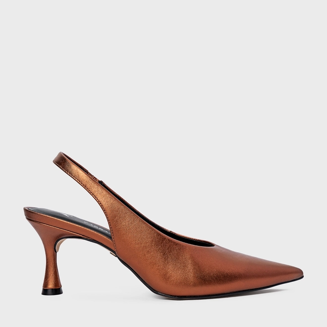 Scarpin slingback em couro metalizado com bico fino alongado. Possui salto fino e elástico traseiro para facilitar o calce.