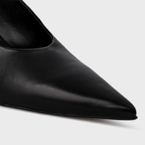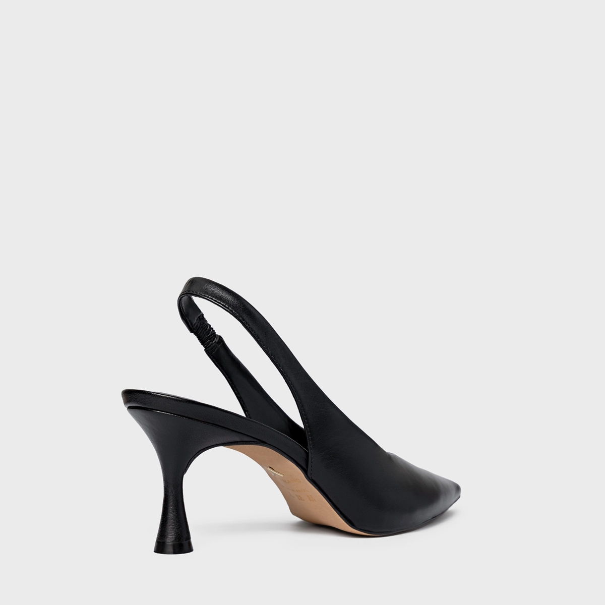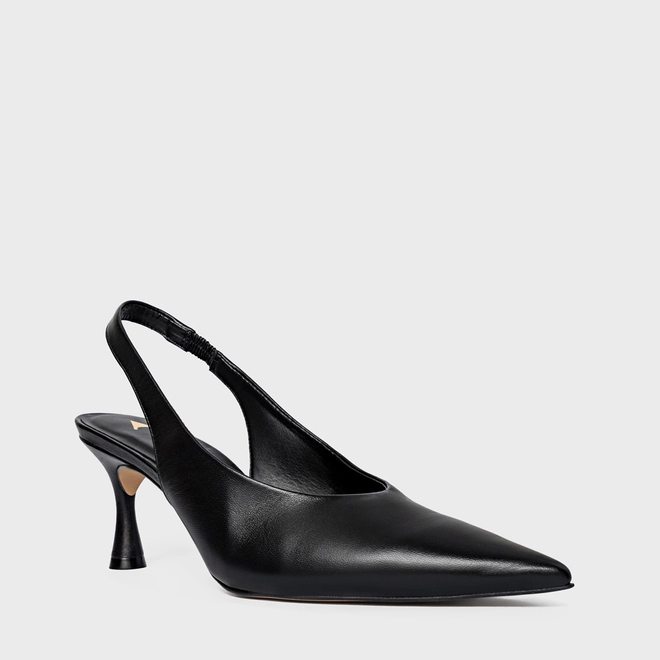 Scarpin slingback em couro com bico fino alongado. Possui salto fino e elástico traseiro para facilitar o calce.