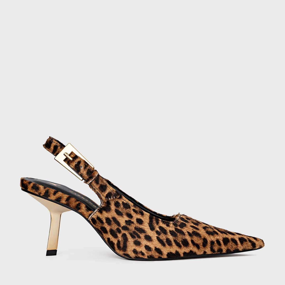 Scarpin slingback em pelo com estampa animal print. Bico fico e o salto ultramoderno com acabamento espelhado stiletto. Possui cabedal fechado e tira traseira com fechamento por fivela ajustável.