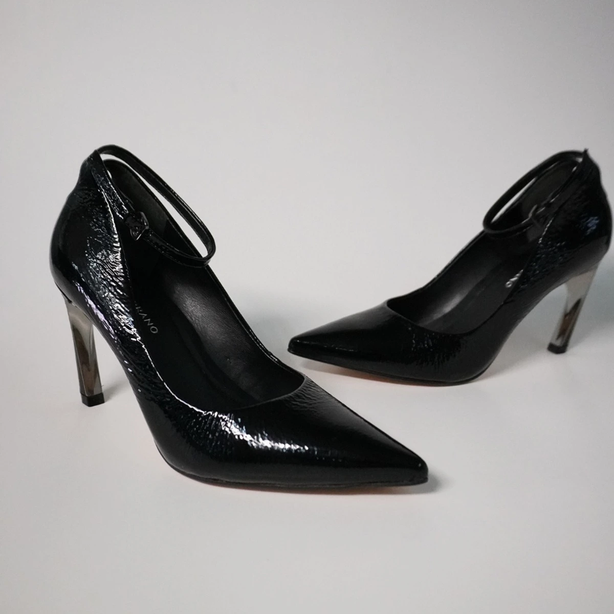Scarpin em couro verniz. O modelo possui o salto ultramoderno com acabamento espelhado. Bico fino, o shape é composto por uma tira que envolve o tornozelo para seu fechamento em fivela.