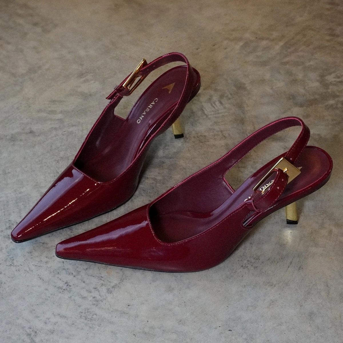 Scarpin em couro verniz. O modelo slingback possui o bico fico e o salto ultramoderno com acabamento espelhado stiletto. Acompanha uma fivela marcante em seu fechamento.