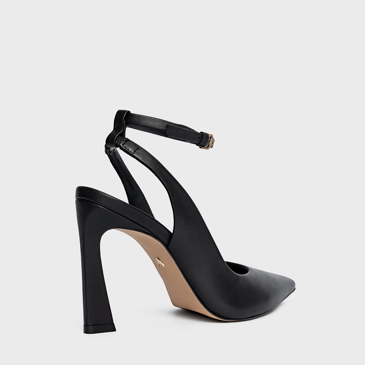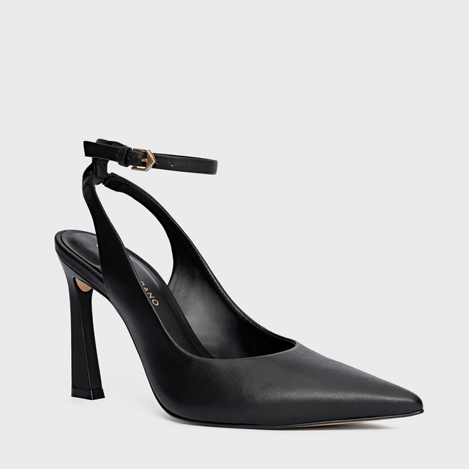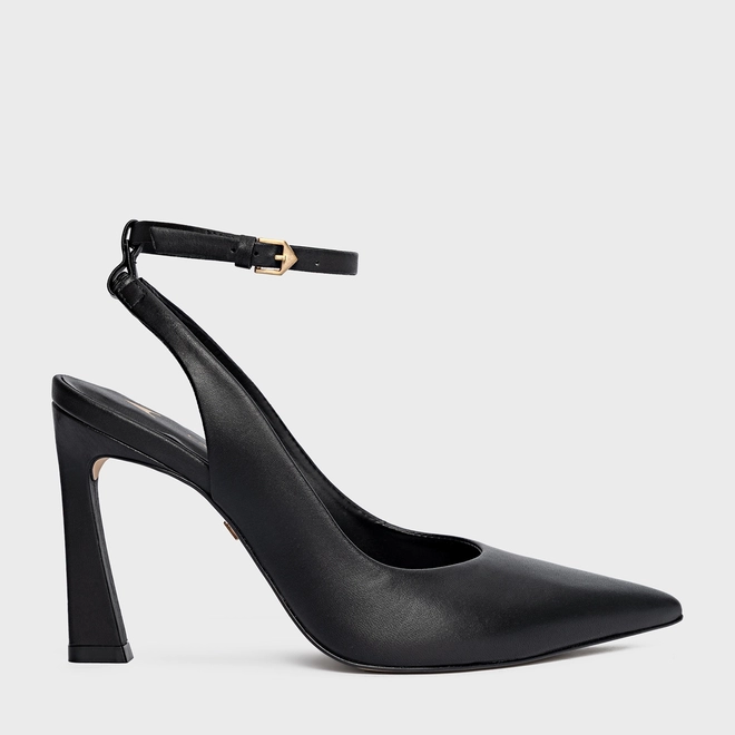 Scarpin slingback de couro. O modelo de salto alto levemente curvado e bico fino. Acompanha a anatomia do pé, prezando pelo conforto e estabilidade na hora do calce.