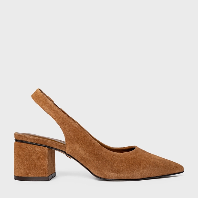 Scarpin slingback em couro suede com bico fino. Possui salto bloco e elástico traseiro para facilitar o calce.