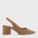 Scarpin slingback em couro suede com bico fino. Possui salto bloco e elástico traseiro para facilitar o calce.