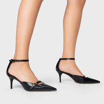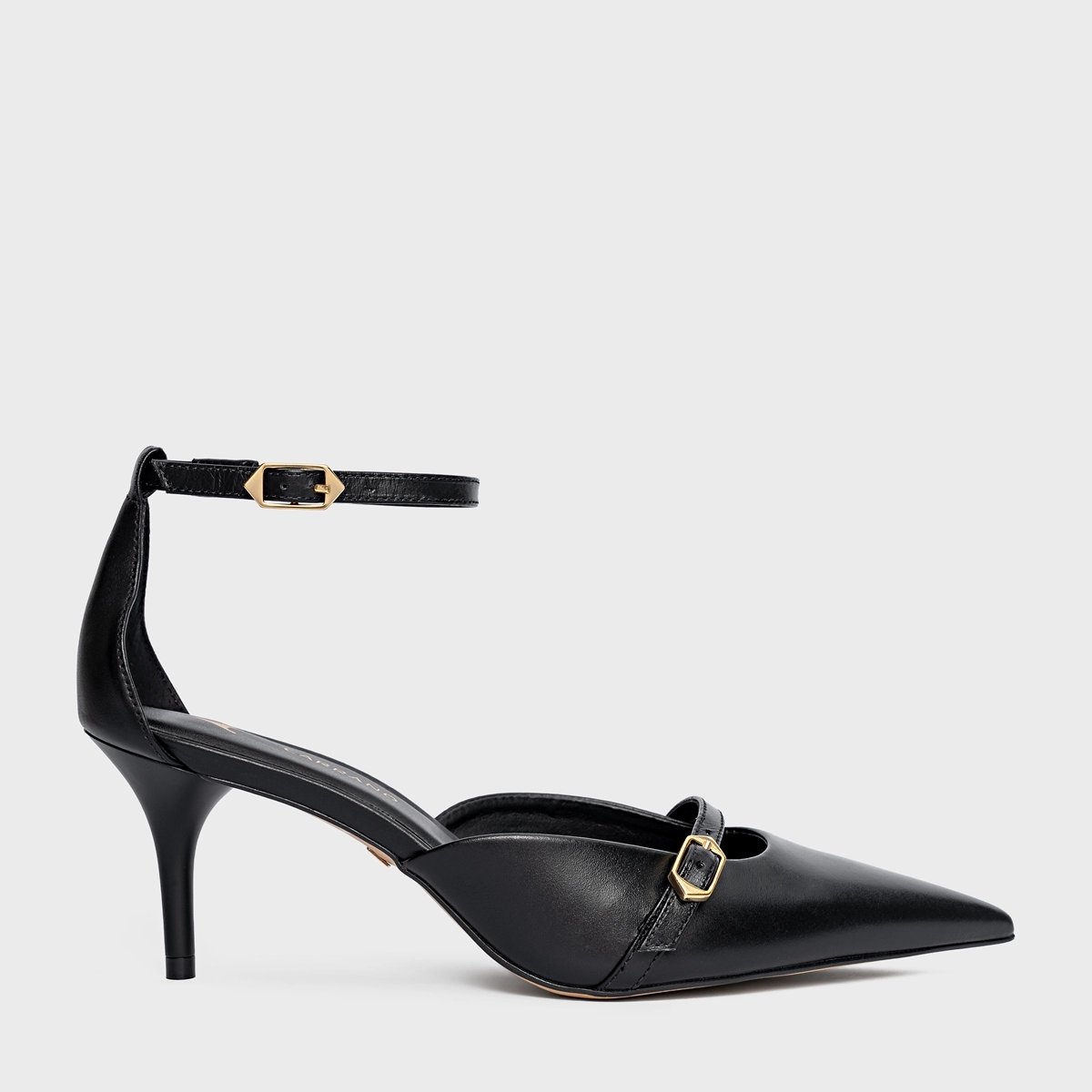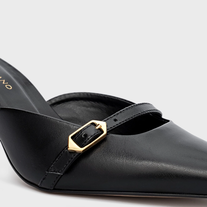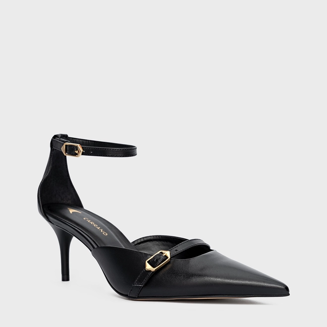 Scarpin de couro com salto médio e bico fino. Possui detalhe de fivela no cabedal e fechamento no tornozelo por fivela ajustável.