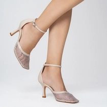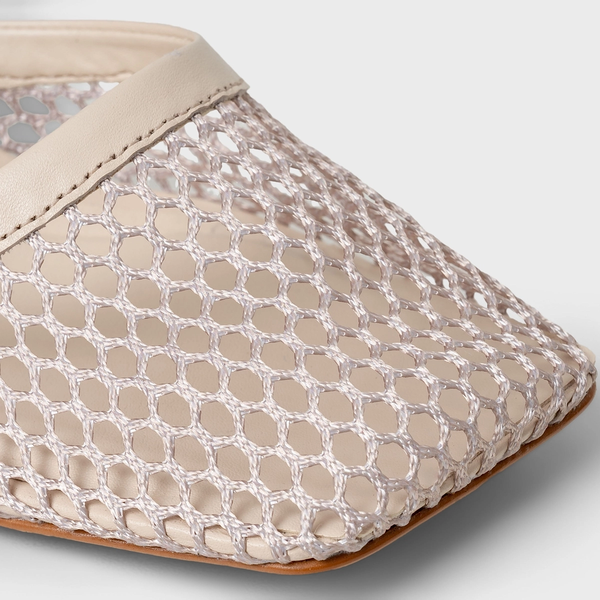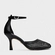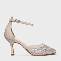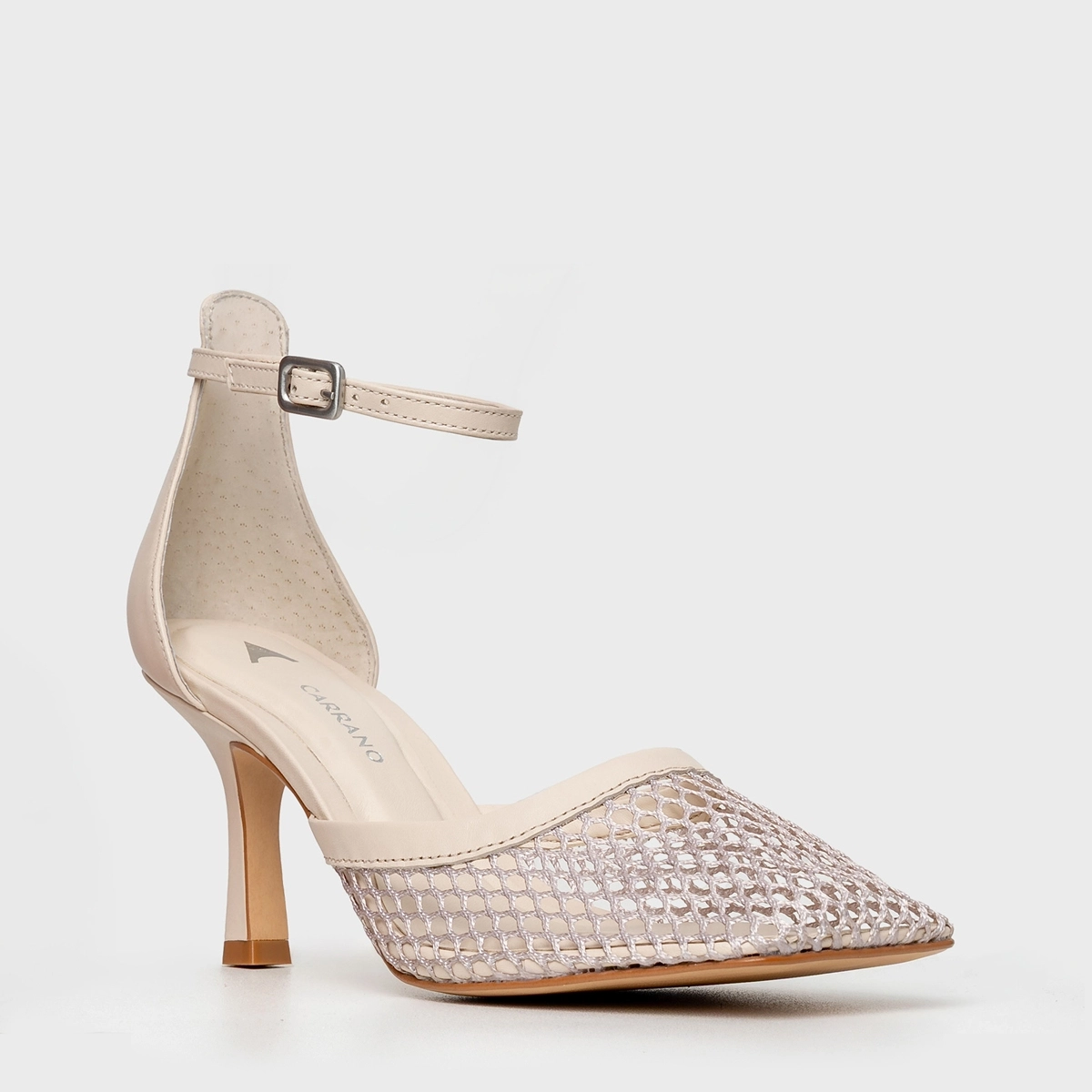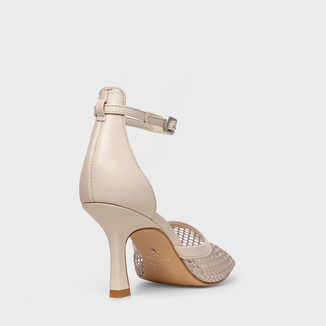 Scarpin de couro com cabedal em tela, bico quadrado e salto médio. Fechamento no tornozelo por fivela ajustável.