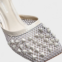 Scarpin em material de tela, com salto fino e bico quadrado. O cabedal apresenta aplicações de tachas na mesma tonalidade e possui fechamento com fivela no tornozelo.