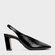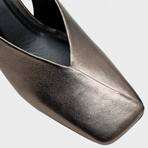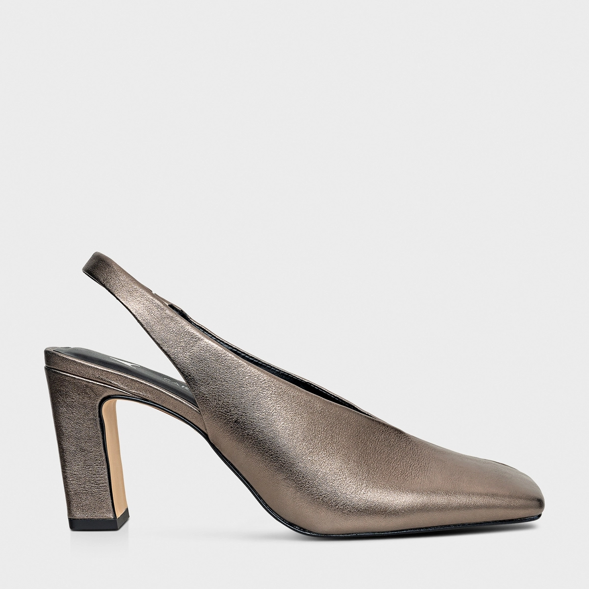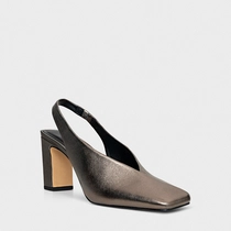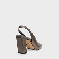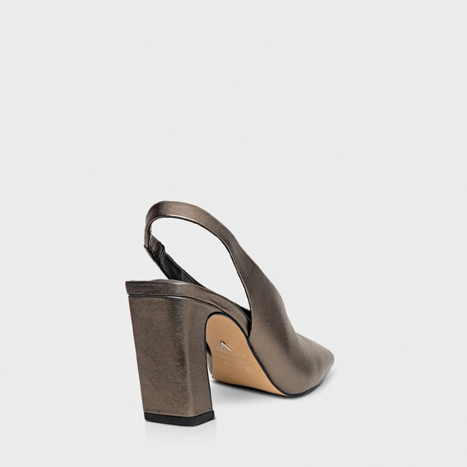 Scarpin slingback em couro metalizado com salto bloco, bico quadrado alongado e cabedal de recorte em V. Palmilha com ícone aplicado e inscrição do nome da marca.