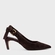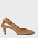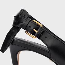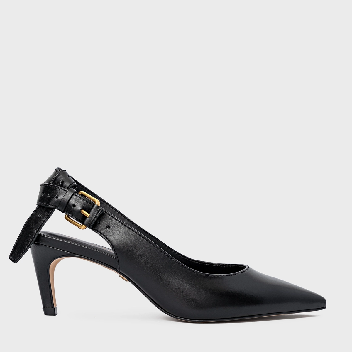 Scarpin slingback em couro, com salto estilo kitten heel. Possui bico fino alongado, decote arredondado e tira traseira com fechamento por fivela ajustável.