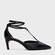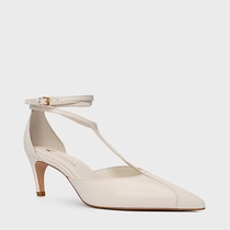 Scarpin slingback de couro com bico fino e salto baixo estilo kitten heel. Conta com tira em formato de “T” no peito do pé que envolve o tornozelo duas vezes com fechamento por fivela ajustável.