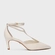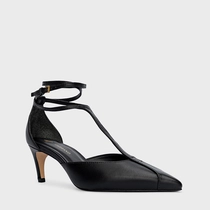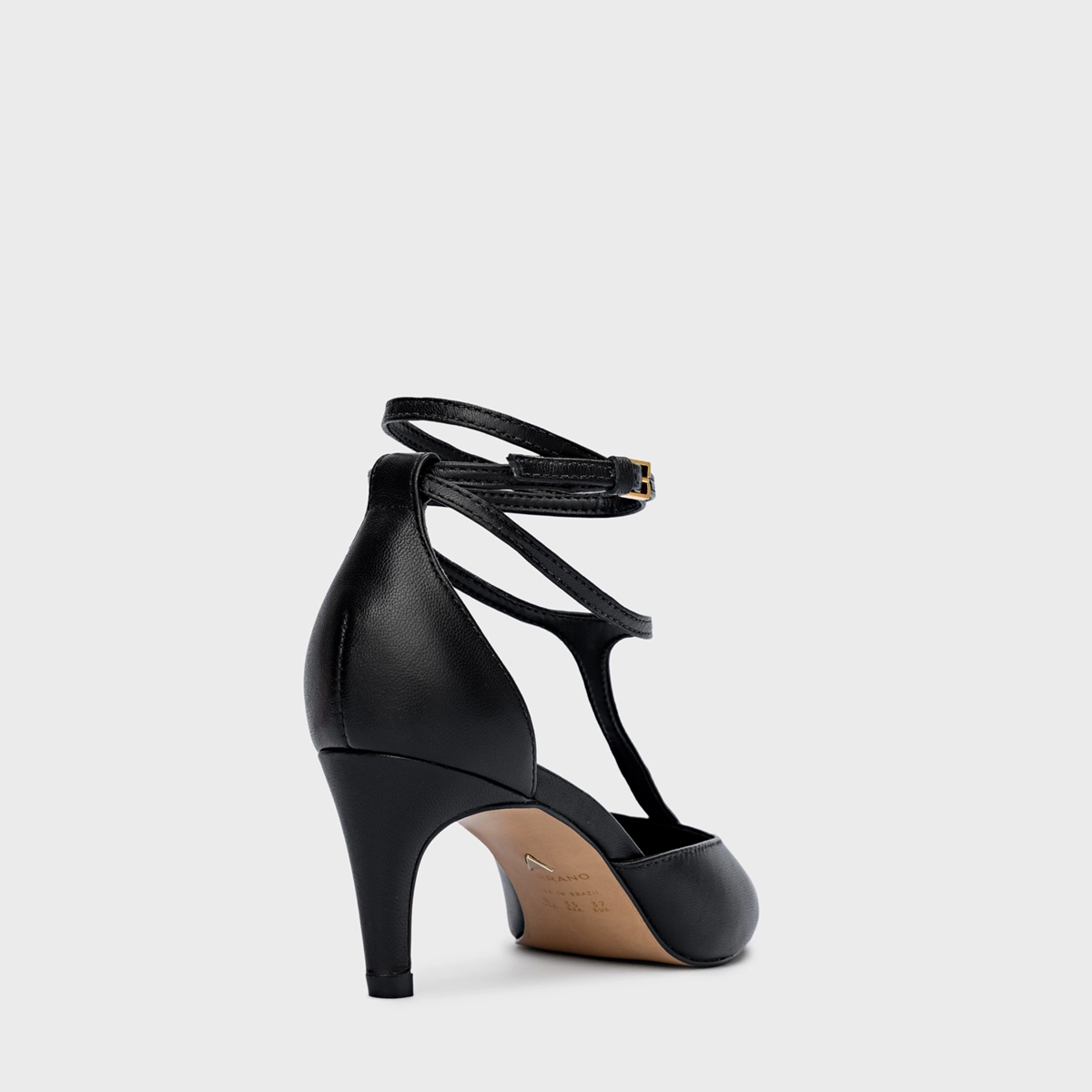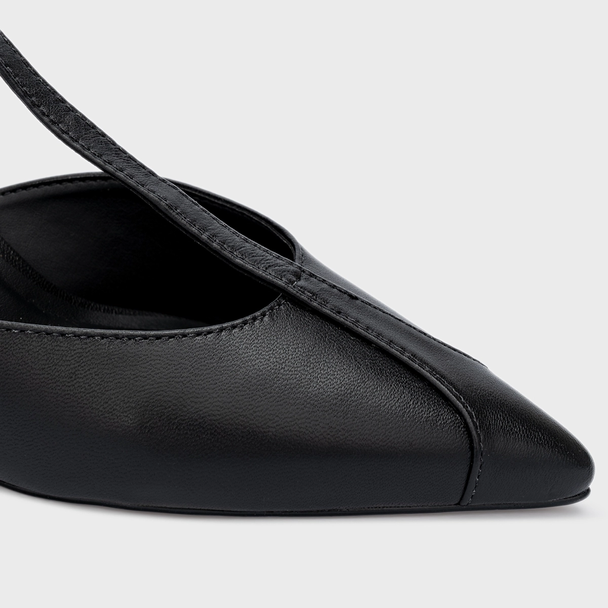 Scarpin slingback de couro com bico fino e salto baixo estilo kitten heel. Conta com tira em formato de “T” no peito do pé que envolve o tornozelo duas vezes com fechamento por fivela ajustável.