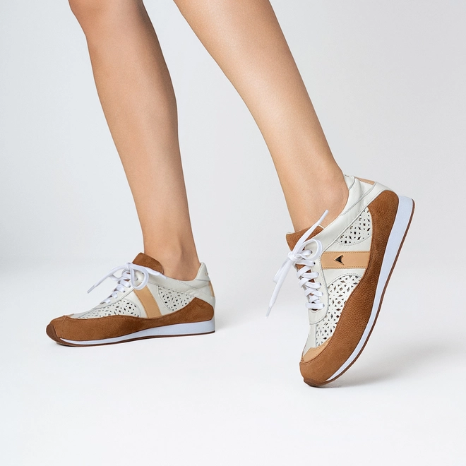 Tênis de couro com bico arredondado e salto flatform. Fechamento por cadarço, laterais com recortes vazados e aplicação do ícone Carrano.