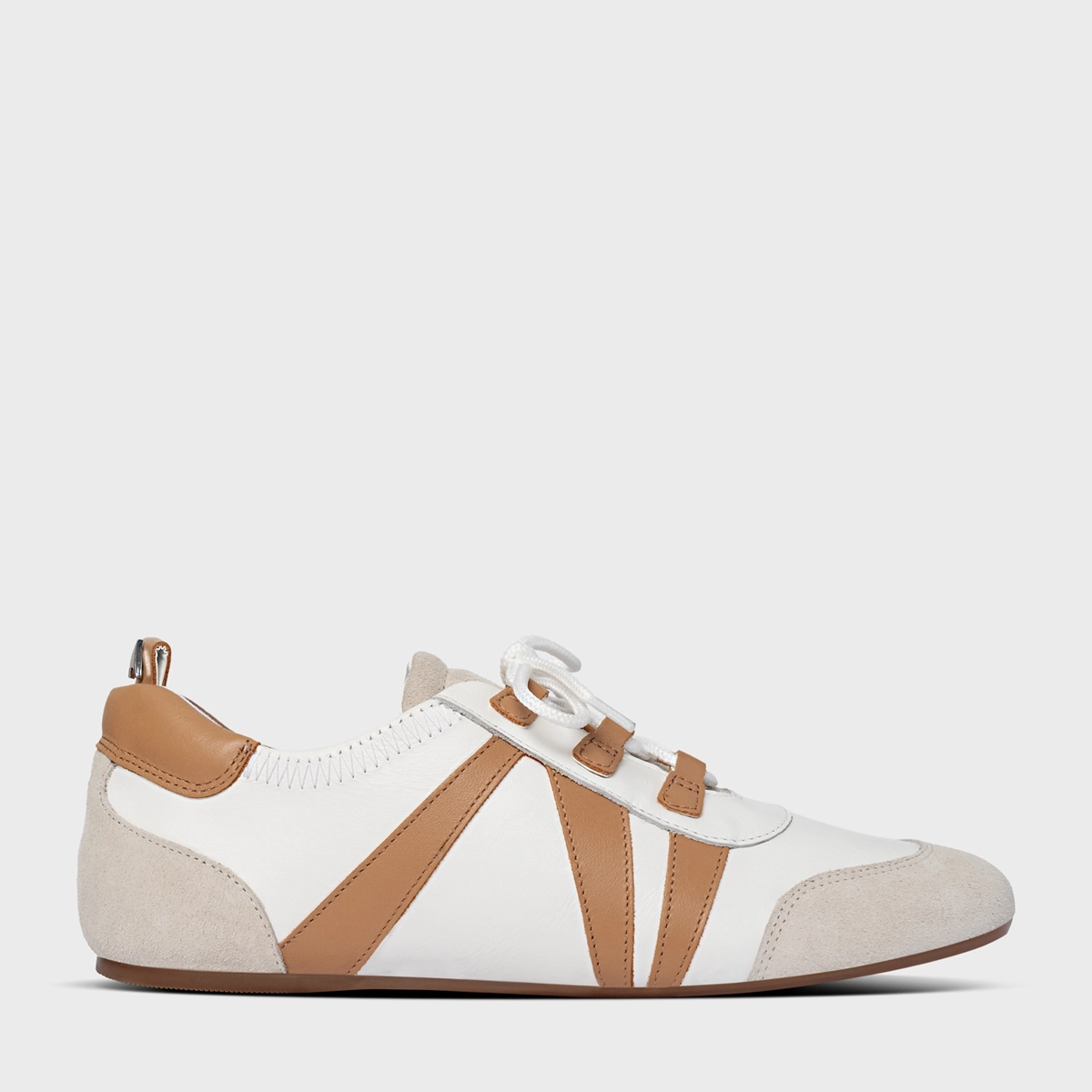 Tênis em couro , bico arredondado e recortes contrastantes em couro e suede. Possui fechamento por cadarço, detalhe aplicado na parte traseira e solado baixo.