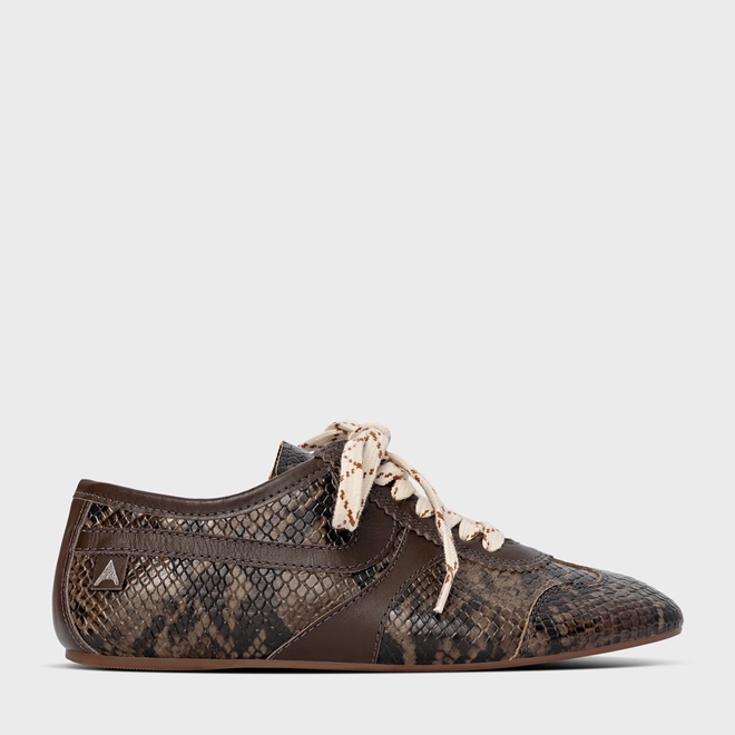 Tênis em couro snake de bico arredondado, com tiras que envolvem o modelo. Possui fechamento por cadarço estampado e solado baixo.