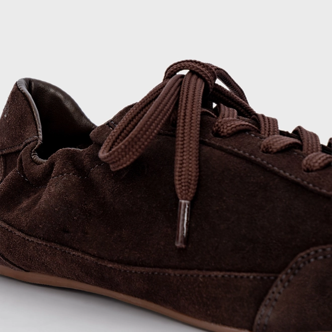 Tênis em couro suede de bico arredondado com cabedal liso. Possui fechamento por cadarço e solado baixo.