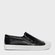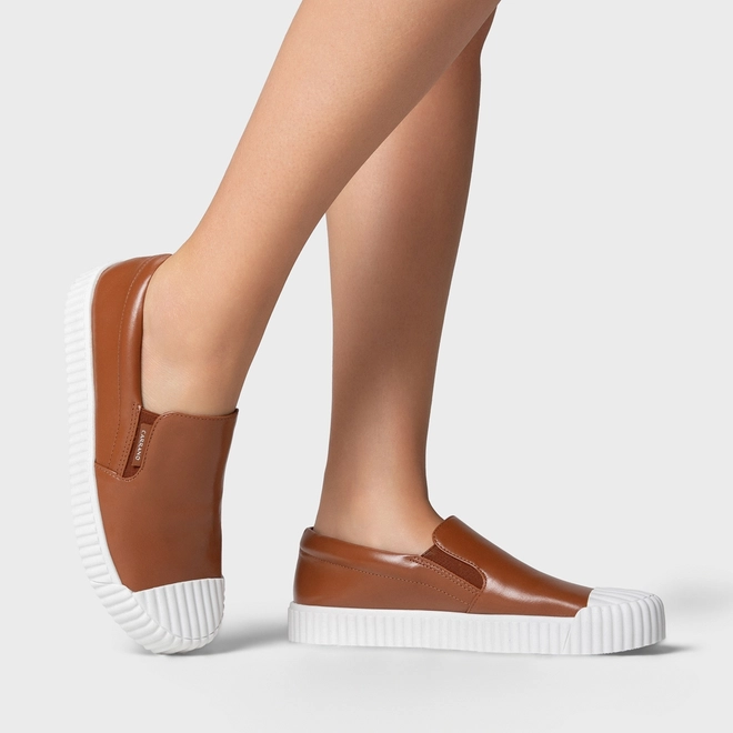 Tênis slip on em couro com solado e bico emborrachados. Destaque para a fita de gorgurão na lateral da gáspea, com a inscrição Carrano.