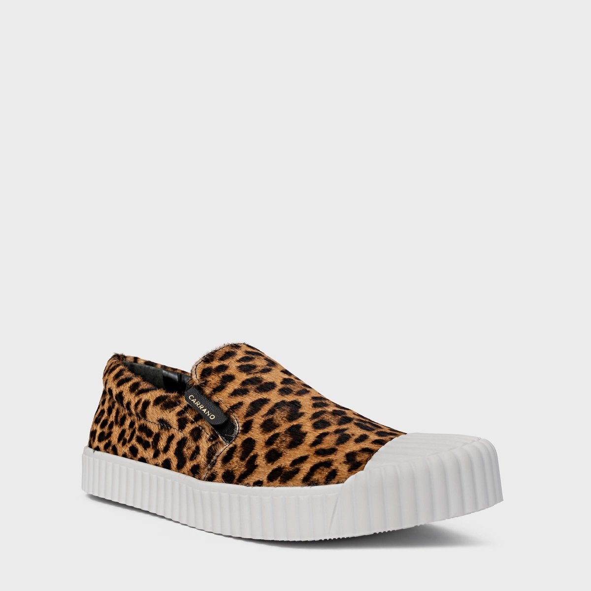 Tênis slip on em pelo com estampa animal print com solado e bico emborrachado. Aplicação de fita de gorgurão na lateral da gáspea e elástico que facilita o calce.