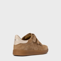 Tênis em couro suede. O modelo possui solado de borracha, shape arredondado e fechamento com três tiras de velcro.